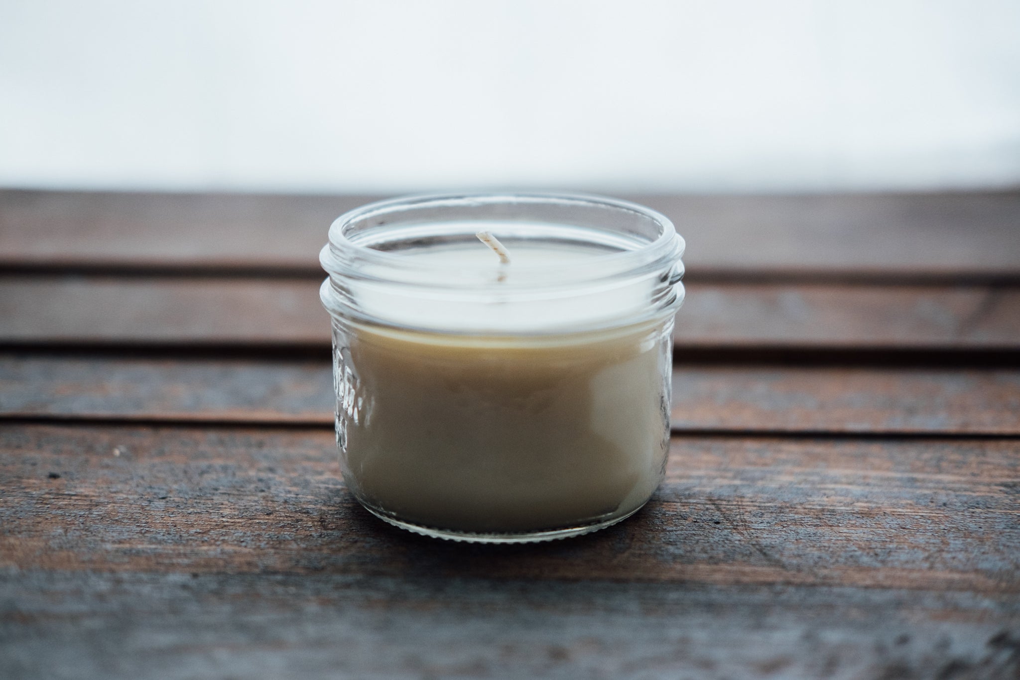 Close up of white soy candle in clear container on brown wooden table.